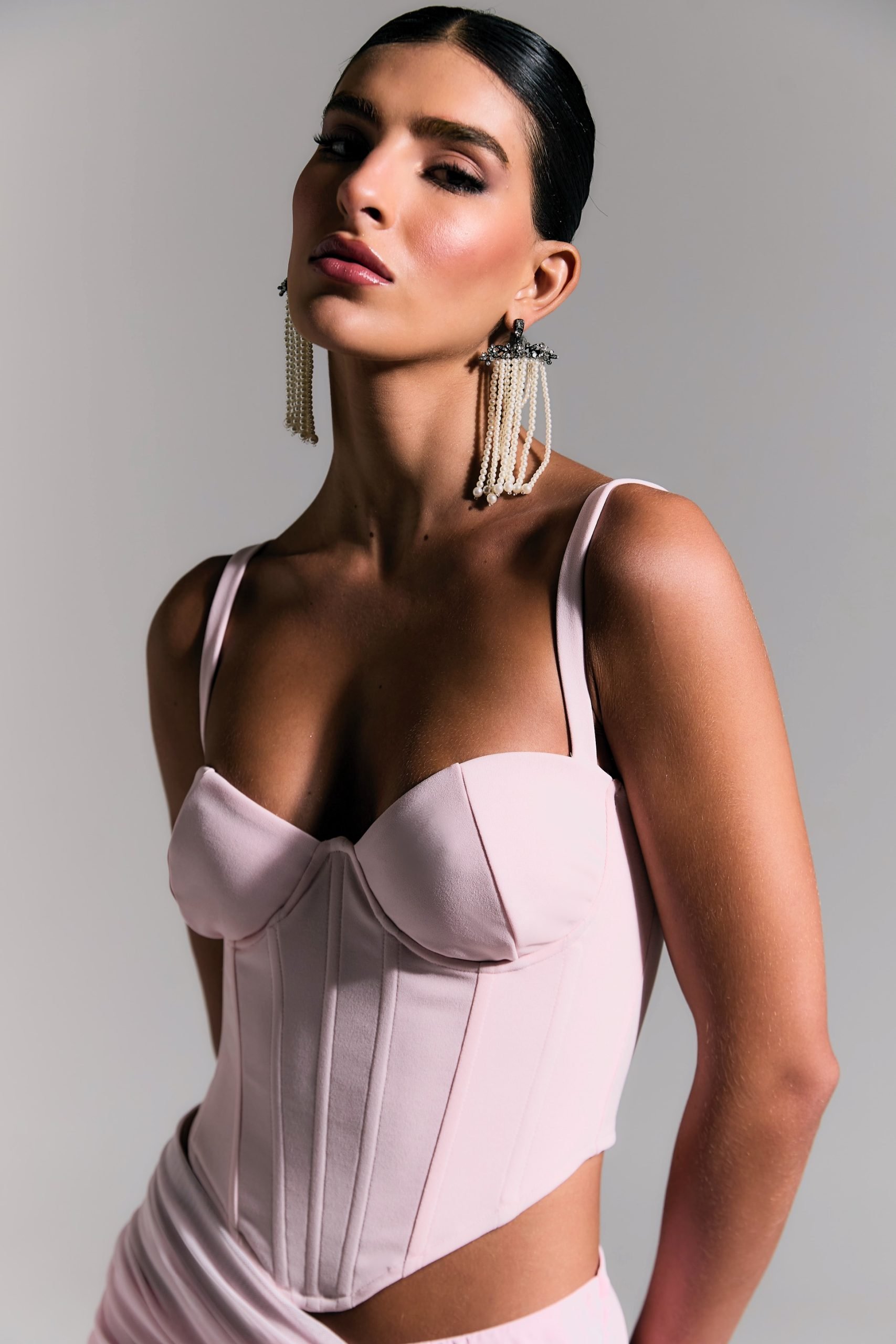 Corset possui arco e barbatanas, ele é todo forrado com zíper destacável nas costas.