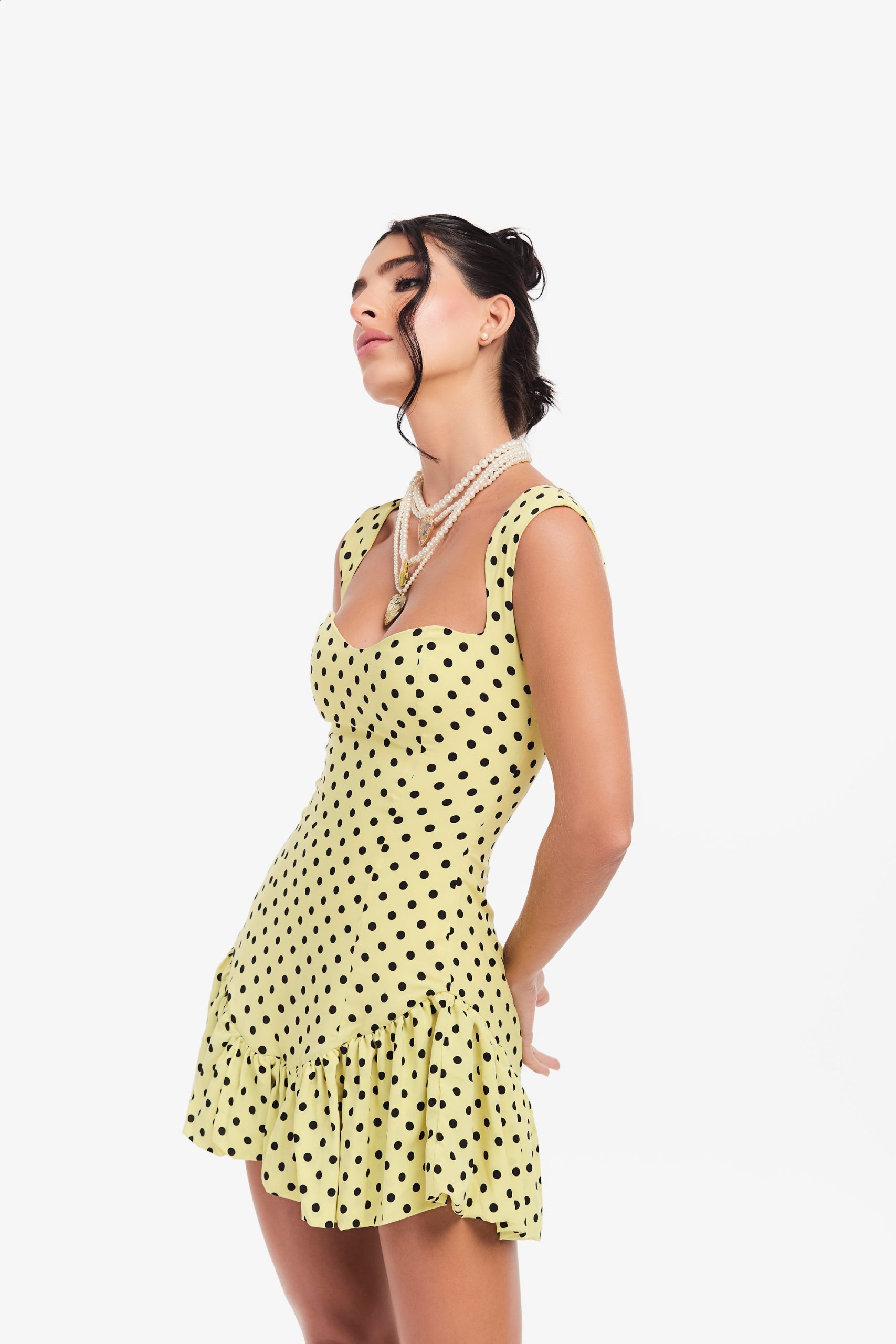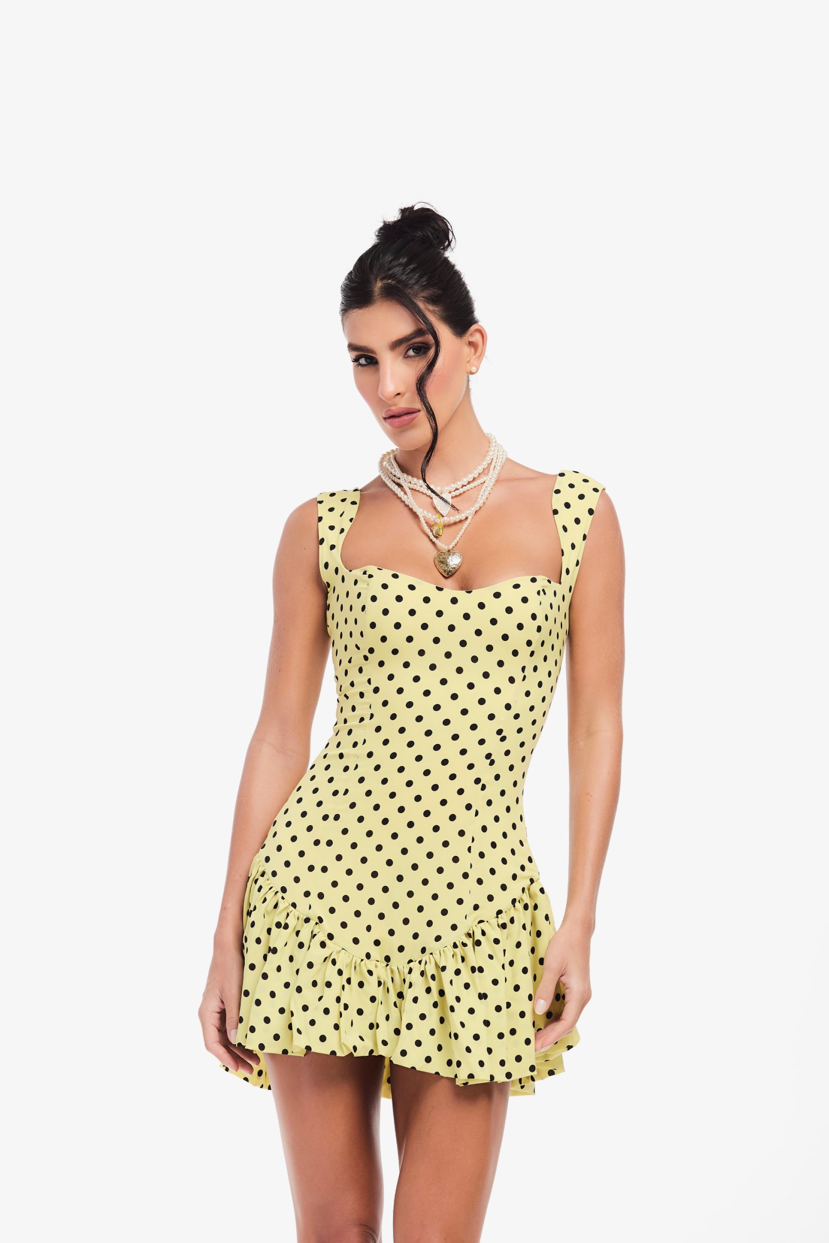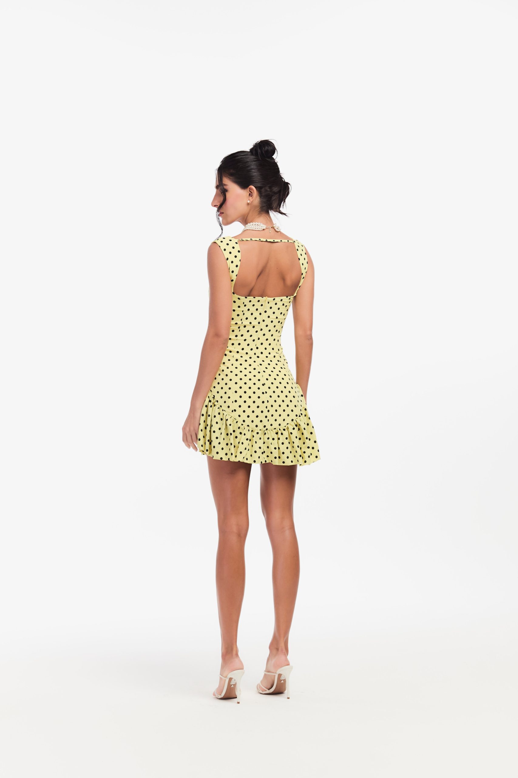 Vestido de poá com zíper invisível nas costas.