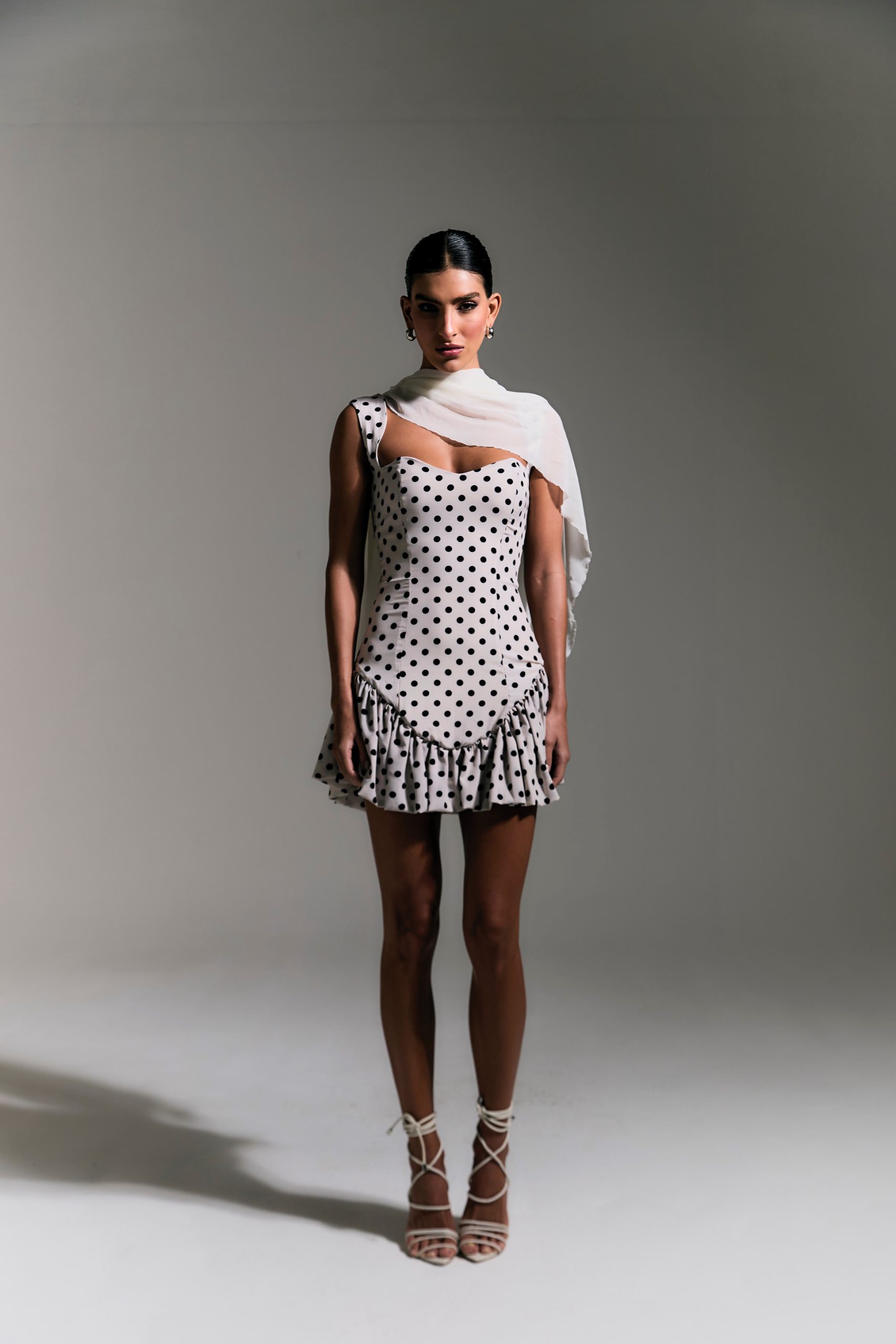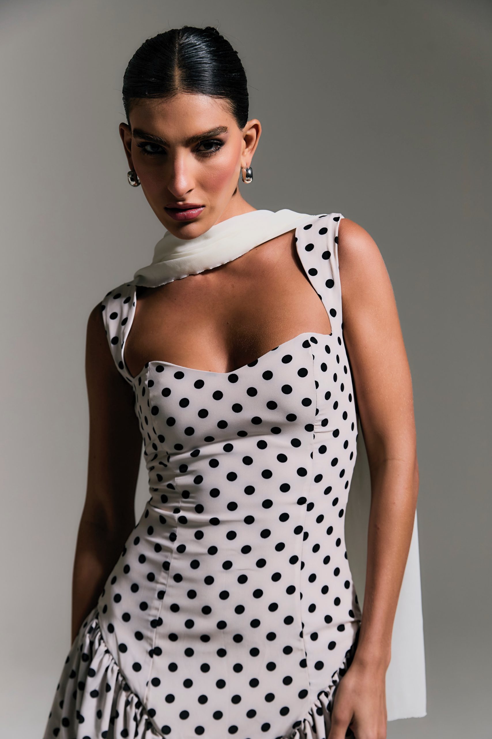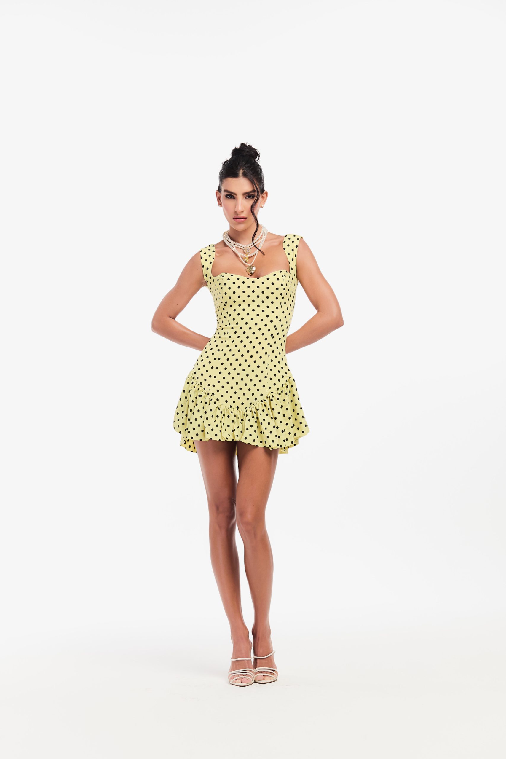Vestido de poá com zíper invisível nas costas.